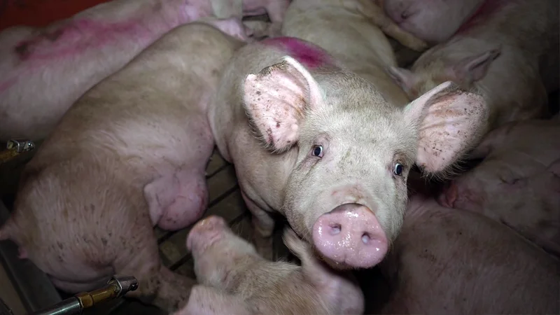 Even though their tails had been cut off without pain relief when they were just days old – a standard but excruciating practice – tail biting remained widespread. We filmed pigs with rotting, bitten ears; some had half of their ears missing completely. Sick and injured pigs were a common sight: ruptured hernias, swollen joints, severe lameness, bites, scratches, coughing and wheezing, and open wounds. ‘Welfare checks’ by workers lasted as little as 90 seconds per shed; a shockingly brief amount of time to check the well-being of 1,000 animals. This grossly inadequate inspection left pigs extremely vulnerable, and they suffered even further as a result of the obvious negligence.
