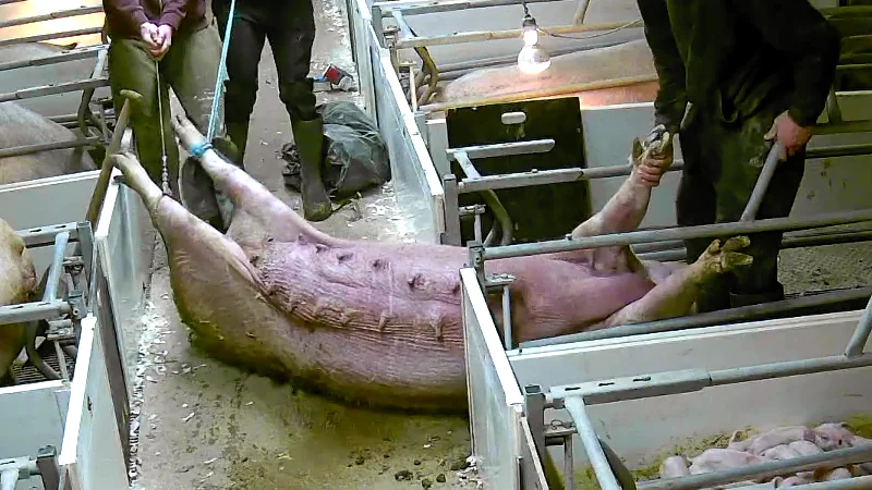 A mother pig, who had given birth the previous day, and who was unable to stand up, was targeted repeatedly by Cranswick’s staff. Over a harrowing four days, she was beaten again and again. She was kicked in the vulva, her stomach stamped on and she was stabbed in the head and face with a metal spade. The workers let their anger loose on her then laughed afterwards.