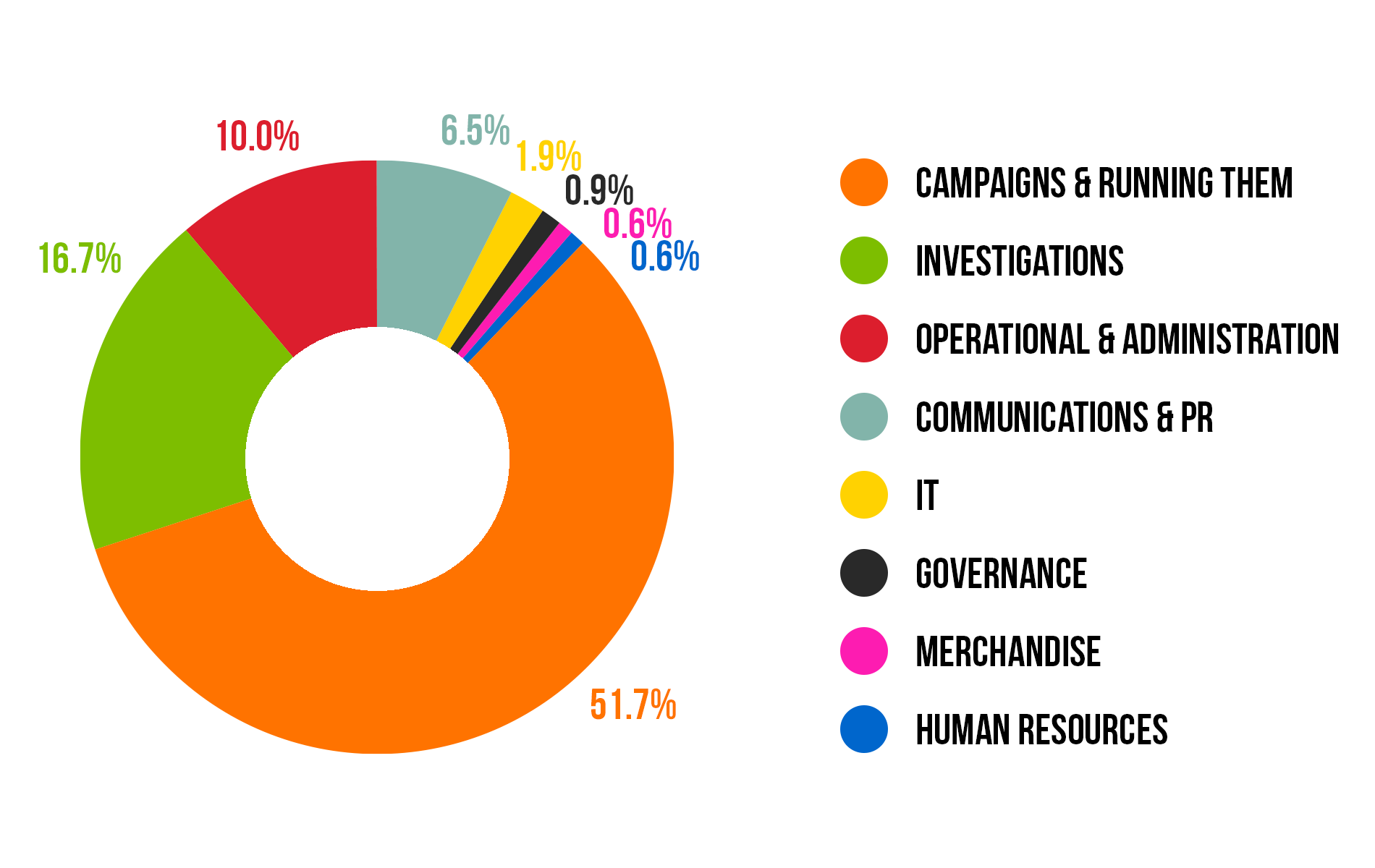 In 2020 XX% of our income was spent on campaigns, XXX on investigations, and XXX both campaigns and staff running them. Just XXX was spend on overheads and just XXX on retained funds.